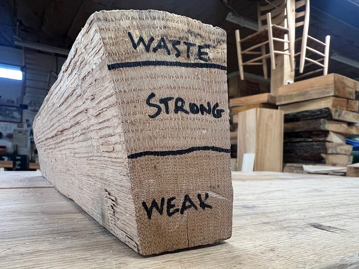 40” lengths of straight grain oak will suffice. I use northern red oak, since it’s beautiful and common to us in midcoast Maine. White oak works, as does ash and other ring-porous hardwoods.